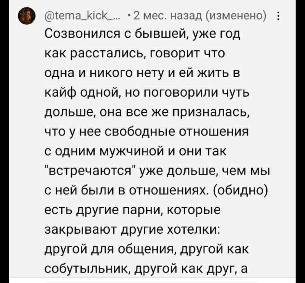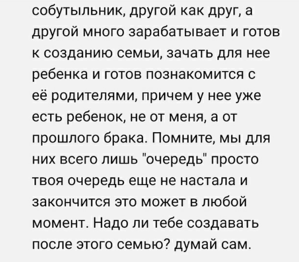 "Я ожидаю, что за меня заплатят на первом свидании (но заведения я почти всегда сама выбираю и знаю, что мой чек не будет больше 2 тысяч рублей). Я всегда предложу заплатить в следующем месте. Оплата для меня определенный культурный код, считаю, что это форма вежливости. Я не ломаюсь и к сексу перехожу сама быстро, первое или второе свидание. Но предлагать мне в переписке секс — для меня бан».