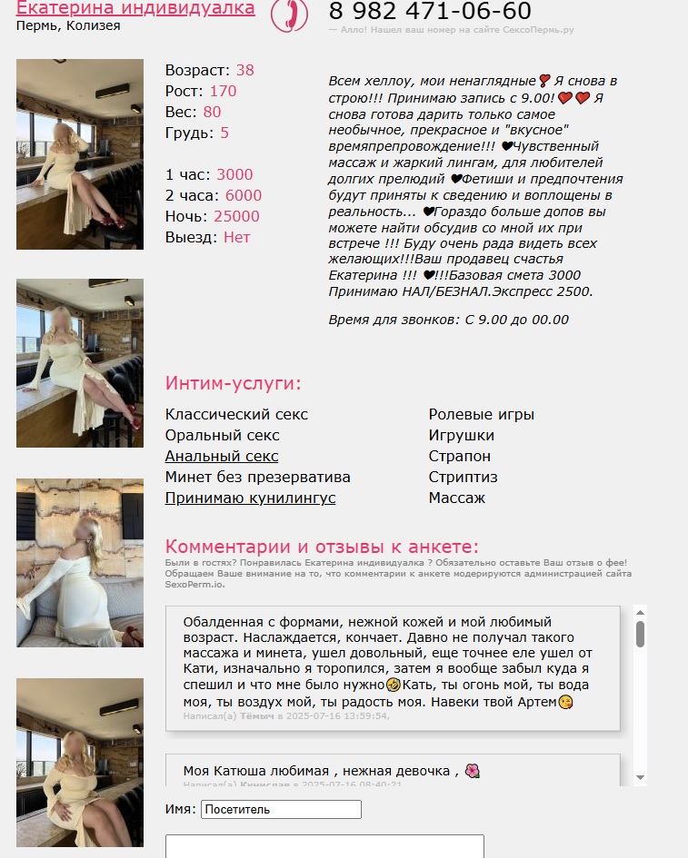 Составлю компанию адекватному, платежеспособному мужчине, о себе: симпатичная блондинка с пышными формами в пределах разумного, выезд в город 2500 час, (МБР и классика в резине), остальные услуги оплачиваются дополнительно, в отдалённые районы 3500 час, а также возможен выезд в область, но строго по предоплате за такси, всё обсуждаемо, есть партнёр мужчина для любителей секса втроём (гетеро), есть игрушки, эротическое бельё, а также предоставляю общение по видеосвязи, вайбер ватсап..., нищеброды, халявщики сразу в игнор, по реальным встречам только звонки, смс не всегда вовремя вижу, на пустую болтовню, а также как у меня дела не отвечаю, сразу блок...