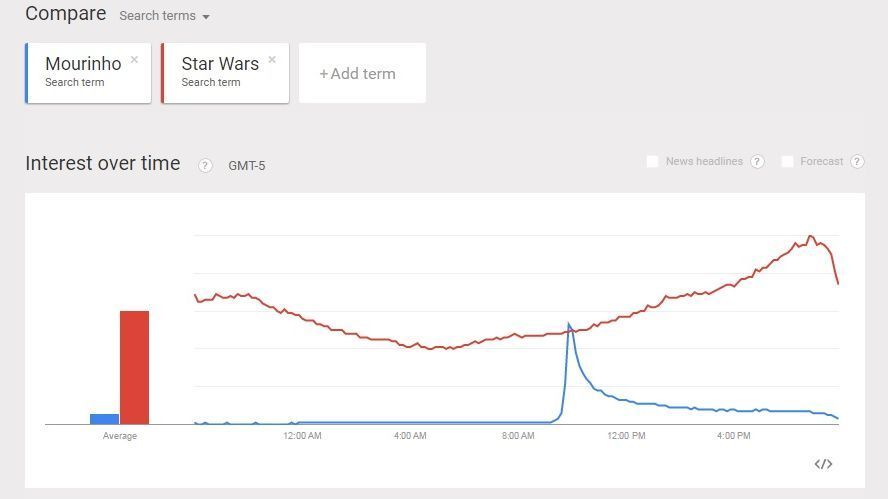 На протяжении приблизительно 25 минут количество поисковых запросов со словом «Моуринью» превышало число запросов по теме «Звездные войны» в Google.