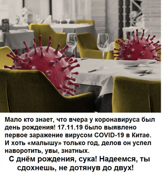 17 гноября 2019 года один пятидесятипятилетний китаец, откушав предварительно подтухшую летучую мышь, обратился к китайским медикам , жалуясь на тяжесть на душе и затруднённое дыхание. Китайские медики сначала посоветовали ему традиционную китайскую медицину применить. Ну, это иглоукалывание и бальзам Звёздочка во все дыры. Но больному становилось хуже и пришлось китайским медикам больного обследовать более тщательно (делали даже ЭКГ) и обнаружить новый вирус, которому похую все лекарства и даже бальзам Звёздочка. Уже потом китайские медики поняли, что это Ковид, но было поздно.